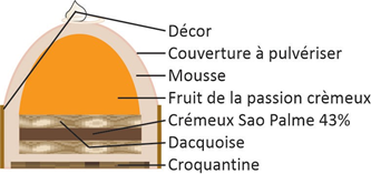 Verser le crémeux Sao Palme 43% sur la Dacquoise dans le cadre, lisser et congeler pendant env. 10 minutes. Poser la deuxième dacquoise, congeler et couper des bandes de 50 x 490 mm, les poser sur le demi-cylindre de fruits de la passion congelé, congeler. Verser la mousse dans un moule à bûche de L 500 x l 80 x P 70. Déposer le demi-cylindre préparé, côté fruit de la passion vers le bas, appuyer légèrement et lisser. Poser la bande de croquantine, appuyer légèrement et lisser. Congeler, démouler et gicler immédiatement avec la couverture à pulvériser (40°C). Décorer.