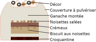 Verser le crémeux sur le biscuit dans le cadre, lisser et congeler. Découper une pièce de 540 x 50 mm, réserver. Monter la ganache et en verser les 3/4 dans le moule à bûche de L 540 x l 80 x P 55 mm. Répartir les noisettes salées hâchées et poser la bande de crémeux/biscuit avec le crémeux vers le bas. Presser légèrement et compléter avec le reste de ganache montée, lisser. Poser la bande de croquantine, appuyer légèrement et lisser. Congeler, démouler et gicler immédiatement avec la couverture à pulvériser. Décorer.
